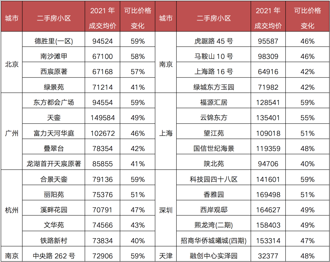 在這其中,廣州和武漢的成交均價漲幅為樣本城市中漲幅最大的兩個城市,分別為2.4%和2.9%,而北京、成都、南京、衢州、佛山、泉州、廊坊等全市整體可比價格較2020年則均出現了一定幅度的下降,其中廊坊下降最多,為2%。