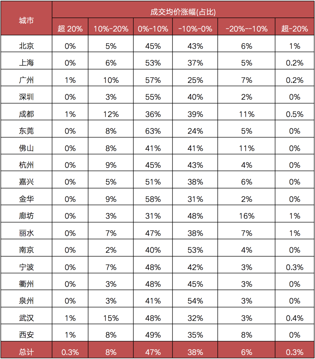 與此同時,成交均價下跌的小區中,6成以上的小區跌幅不足10%。除北京、天津稍高外,上海、深圳、廣州等城市跌幅超10%的小區占比不足全市10%,因此市場直觀感受中在售項目罕有“跌勢”。