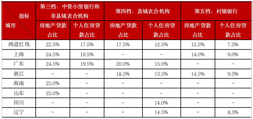 上海、廣東、浙江、海南、山東、四川、遼寧等多省市依規(guī)上調(diào)中小型銀行房貸占比上限,平衡好中小型銀行經(jīng)營壓力和金融風險防控。例如上海第三檔和第五檔銀行的房貸占比上限分別提高2個百分點和1.5個百分點,又如廣東省第三檔和第四檔銀行的房貸占比上限分別提升2個百分點和2.5個百分點。