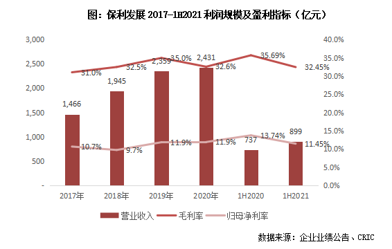 從盈利水平來(lái)看,2021上半年保利的毛利率為32.45%,同比減少3.42個(gè)百分點(diǎn),凈利率和歸母凈利率也分別同比下降1.75和2.29個(gè)百分點(diǎn)至16.34%和11.45%,盈利水平雖有所下降但仍屬于行業(yè)高位。