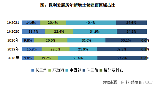 2021上半年末保利發(fā)展總土地儲(chǔ)備為17263萬(wàn)平方米,較期初增長(zhǎng)1.0%,而得益于上半年保利加大拿地的權(quán)益,總土儲(chǔ)建面權(quán)益同比增長(zhǎng)1.2個(gè)百分點(diǎn)至67.1%。就土儲(chǔ)分布來(lái)看,37.7 %位于珠三角區(qū)域,中西部區(qū)域占比為32.2%,環(huán)渤海19.3%,長(zhǎng)三角相對(duì)較少,占比為10.4%。
