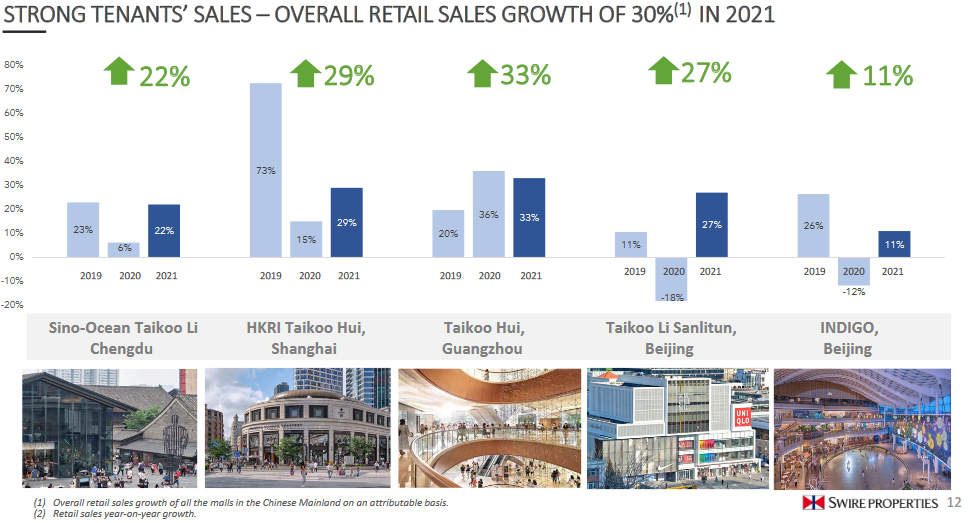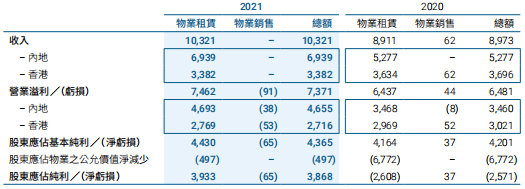 2021年集團(tuán)中國(guó)內(nèi)地投資物業(yè)組合的租金收入總額增加24%至港幣35.61億元,主要反映零售銷售額上升及人民幣升值。