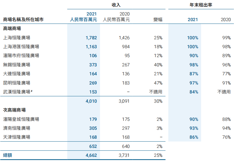 辦公樓組合方面,占內(nèi)地物業(yè)租賃收入總額的17%。2019和2020年開(kāi)業(yè)的三座新辦公樓租出率持續(xù)上升,令辦公樓的總收入錄得16%的升幅。