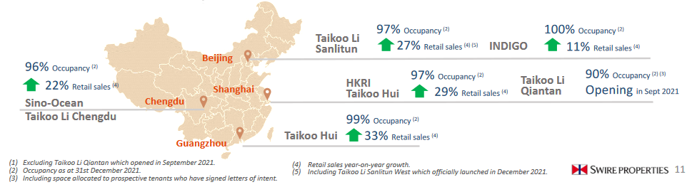零售物業(yè)方面,來(lái)自中國(guó)內(nèi)地零售物業(yè)的應(yīng)占租金收入總額增長(zhǎng)29%至港幣43.99億元。撇除租金支援?dāng)備N和人民幣升值的影響,集團(tuán)應(yīng)占租金收入總額上升17%。2021年12月31日,集團(tuán)中國(guó)內(nèi)地已落成零售物業(yè)的估值為港幣693.74億元。