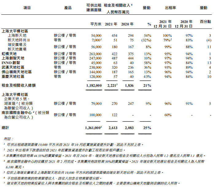 租金及相關(guān)收入增加22%。主要是由于銷售額及客流量增加,以及上海新天地的一部分在完成資產(chǎn)提升計(jì)劃并于2020年11月16日試業(yè)后的全年貢獻(xiàn)。
