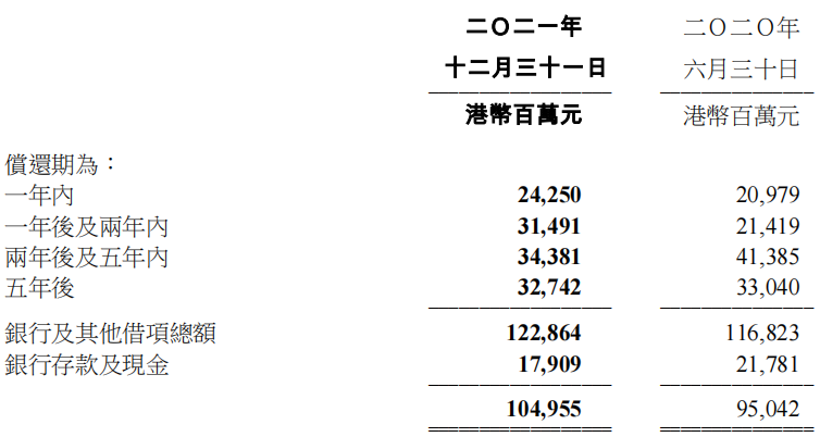 債務(wù)方面,截至2021年12月31日的負(fù)債比率為17.5%。截至2021年12月31日,債項(xiàng)總額為港幣1228.64億元??鄢y行存款及現(xiàn)金港幣179.09億元的凈債項(xiàng)為港幣1049.55億元。