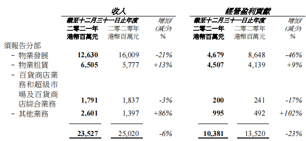 銷售物業(yè)收入為126.30億港元,租金收入為65.05億港元,百貨商店業(yè)務(wù)和超級(jí)市場(chǎng)及百貨商店綜合業(yè)務(wù)收入為17.91億港元,其他業(yè)務(wù)收入為26.01億港元。