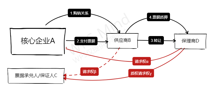 在簡單模型中,供應商B僅以應收賬款α向保理商申請保理融資,并未將票據背書轉讓給保理商D,此時為確保保理商D的權利可以延及票據,供應商B將票據質押給保理商D,擔保的主債權可能債權α,也可能是供應商B在保理合同項下的各項義務或承諾(包含回購義務)。