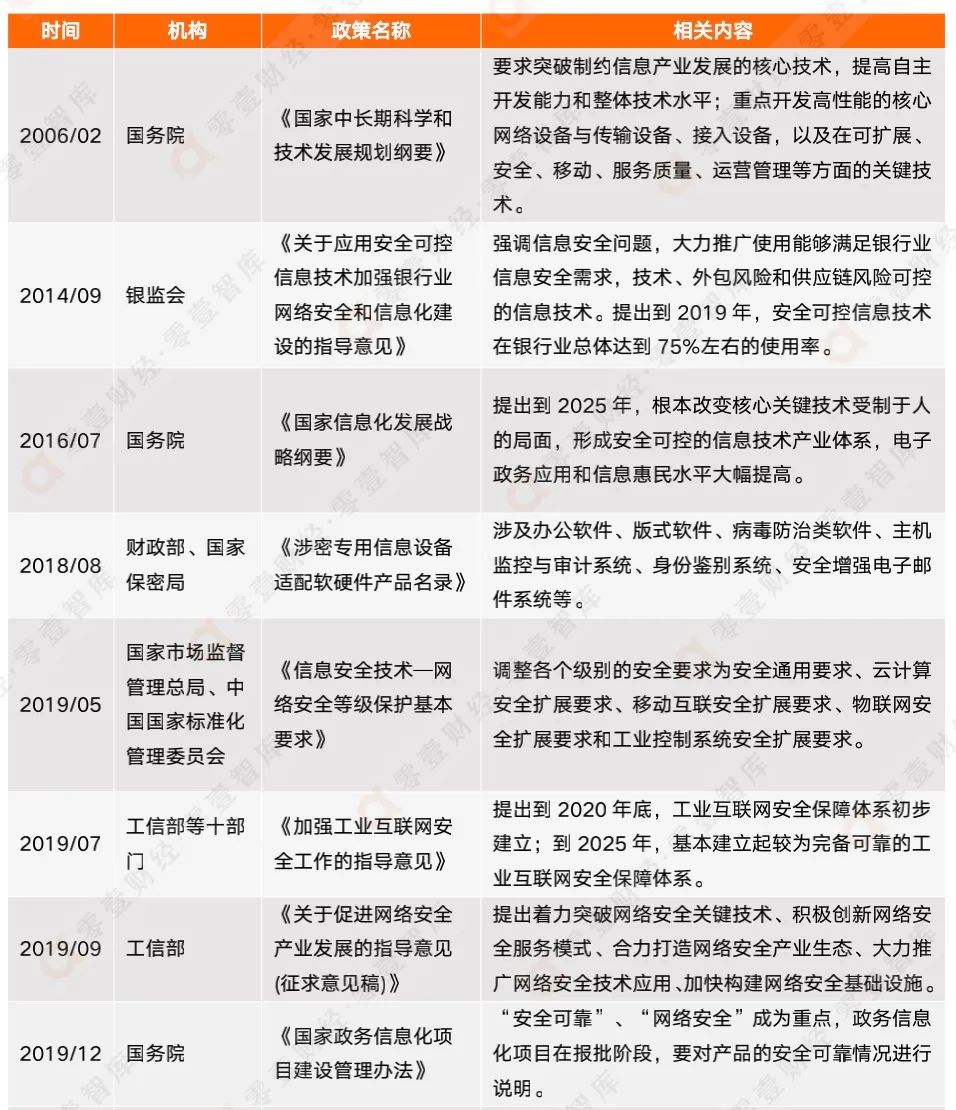 據(jù)零壹智庫(kù)不完全統(tǒng)計(jì),2006年至今,國(guó)務(wù)院各部門共出臺(tái)信創(chuàng)相關(guān)政策文件27份。其中,有11份政策文件重點(diǎn)提及“網(wǎng)絡(luò)安全”和“信息安全”,占總文件數(shù)量的40.74%。在2021年——信創(chuàng)發(fā)展的關(guān)鍵之年,國(guó)務(wù)院更是出臺(tái)兩份政策文件,再次強(qiáng)調(diào)網(wǎng)絡(luò)安全和信息安全的重要性。