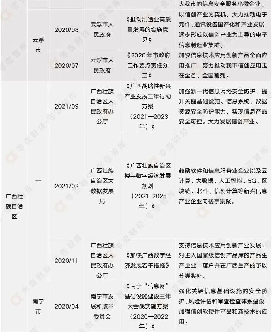 雖然信創(chuàng)產(chǎn)業(yè)如今大熱,但鮮有政府出臺(tái)信創(chuàng)專項(xiàng)政策,目前僅有廣州市工業(yè)和信息化局出臺(tái)的《廣州市軟件和信創(chuàng)產(chǎn)業(yè)鏈高質(zhì)量發(fā)展三年行動(dòng)計(jì)劃(2021-2023年)》。信創(chuàng)產(chǎn)業(yè)的發(fā)展并不久遠(yuǎn),相信隨著信創(chuàng)的進(jìn)一步發(fā)展,其重要性會(huì)更加凸現(xiàn),政府的關(guān)注度和重視程度也會(huì)大幅提高。