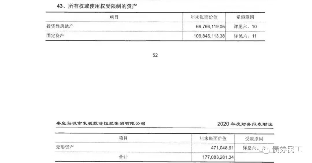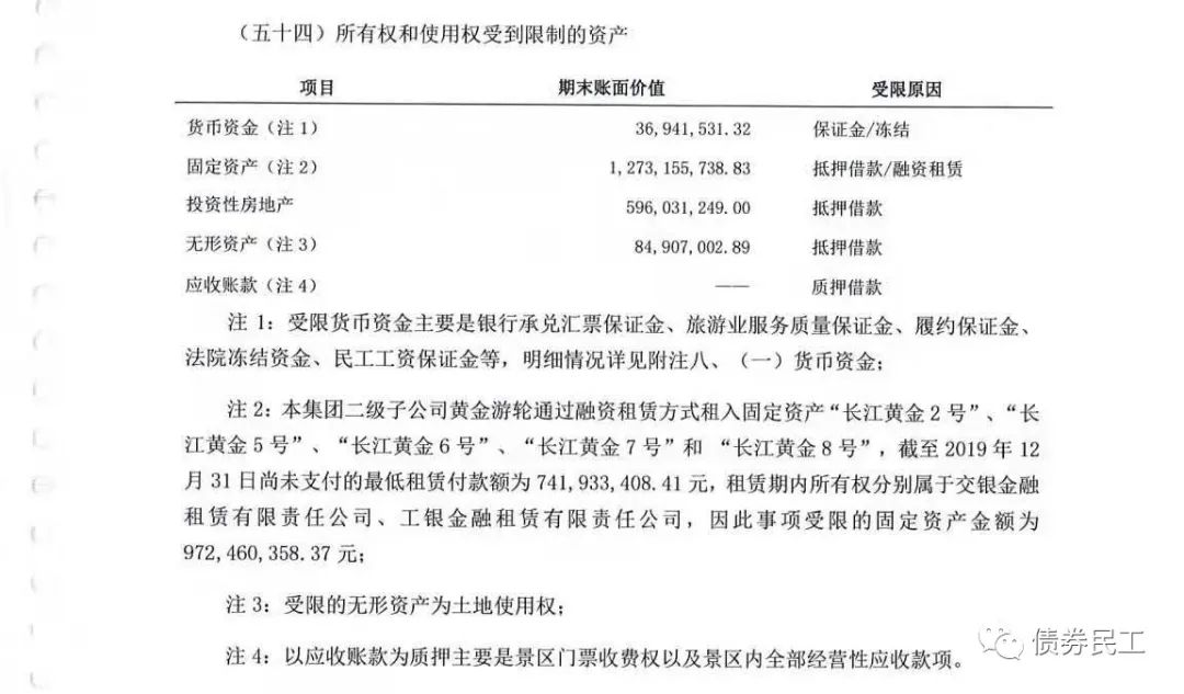 2、從重慶旅投公布的2020年審計(jì)報(bào)告來看,對(duì)于受限資產(chǎn)的描述同樣是按照會(huì)計(jì)科目進(jìn)行的,在表格下進(jìn)行了對(duì)受限資產(chǎn)進(jìn)行了簡要的匯總描述,沒有針對(duì)每筆首先資產(chǎn)的情況進(jìn)行介紹。