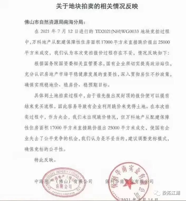 事情的梗概很簡(jiǎn)單,就是保利和中海兩家房企,向佛山南海自然資源分局反映情況,話說(shuō)萬(wàn)科拿地不講規(guī)則,不按套路出牌,導(dǎo)致國(guó)有企業(yè)沒拿地,讓國(guó)企喪失了公平競(jìng)爭(zhēng)的機(jī)會(huì)。