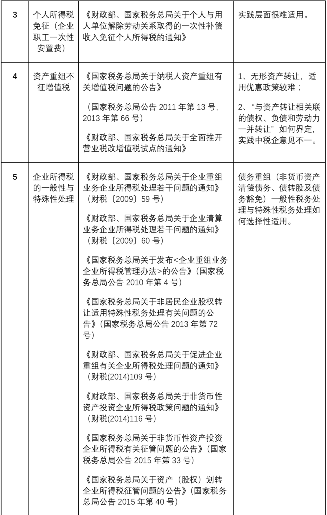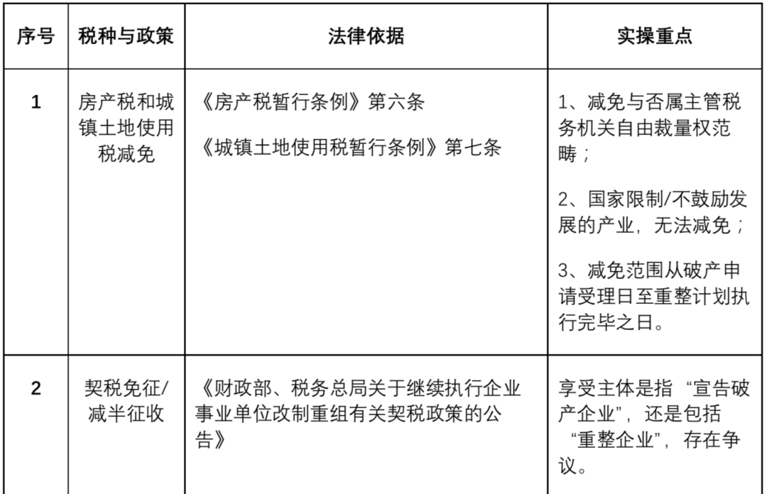 我國(guó)目前沒(méi)有專門針對(duì)破產(chǎn)企業(yè)適用的稅收優(yōu)惠政策,這也增大了在破產(chǎn)程序中對(duì)稅負(fù)成本預(yù)測(cè)的難度。筆者對(duì)目前我國(guó)破產(chǎn)程序中涉及的稅收優(yōu)惠政策整理如下(表二):