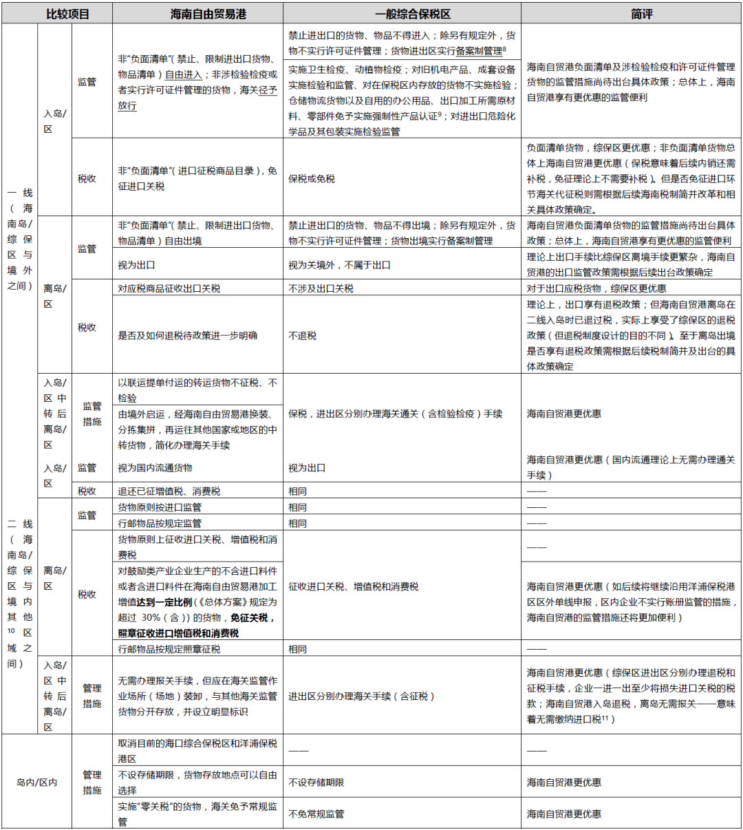 為便于進(jìn)一步了解海南自貿(mào)港海關(guān)監(jiān)管特殊區(qū)域制度,我們將其與一般的海關(guān)特殊監(jiān)管區(qū)域(以綜合保稅區(qū)(以下簡(jiǎn)稱(chēng)“綜保區(qū)”)為例)做了比較說(shuō)明(詳見(jiàn)附件表格)。
