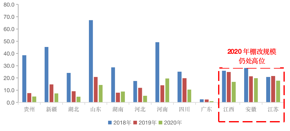江蘇、安徽和江西等棚改市場規模整體仍處高位。例如江蘇省,2020年棚改計劃開工17.7萬套,較2018年高峰期下降18%。