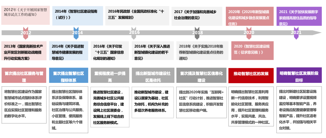 自2012年起,國家多部委就智慧城市的發展提出了多項政策文件,其中,智慧社區作為智慧城市建設中的關鍵節點也被多次提及。無論是從政策發布的頻率,還是相關細則中對于智慧社區建設目標的不斷明確來看,整體政策上都呈現一種向上利好的態勢。