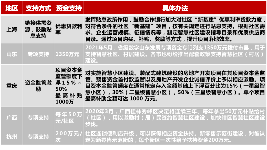 2021年4月,住建部等16部門聯合發布《關于加快發展數字家庭提高居住品質的指導意見》,明確指出要加快發展數字家庭,提高居住品質。政策細則對于智慧社區的建設標準已經逐漸清晰,智能安防、消防監測、環境監測、智慧設施成為基本配置,并且在此基礎上,鼓勵建設智慧養老、智能充電樁等配套智慧公共設施,同步推進智慧社區服務平臺的搭建,對接各類商業服務,構建線上線下生活服務圈,滿足居民多樣化生活服務需求。各地也及時積極響應國家政策,陸續跟進出臺各種鼓勵細則助推智慧社區建設發展。