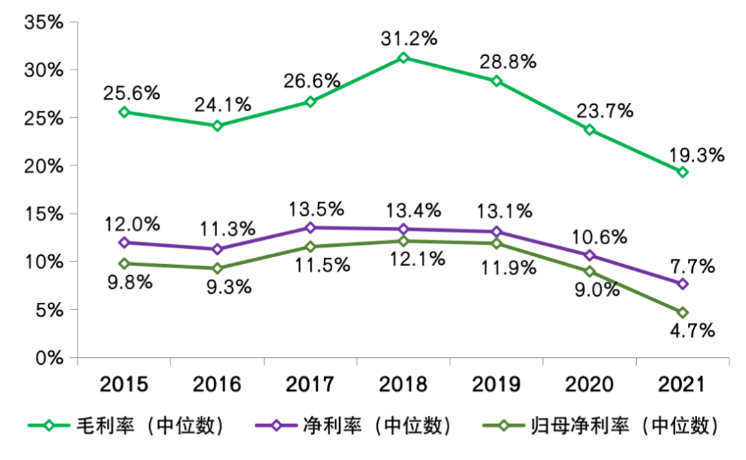 圖:2015-2021年行業典型上市房企整體利潤率水平及變動