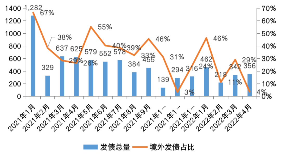 圖:2021年至2022年4月房企發債總量及境外債占比(億元)