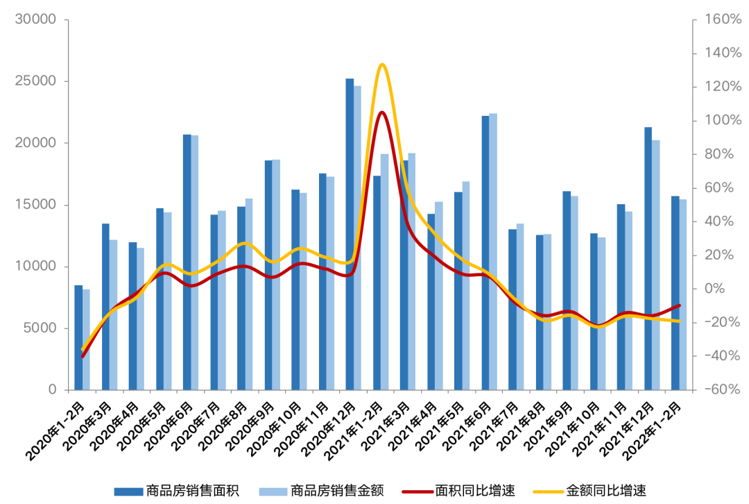 從銷售數(shù)據(jù)來看,國(guó)家統(tǒng)計(jì)局?jǐn)?shù)據(jù)顯示2022年1-2月,商品房銷售面積15703萬平方米,同比下降9.6%;商品房銷售額15459億元,下降19.3%。兩者增速為2016年以來7年次低,僅高于2020年1-2月。