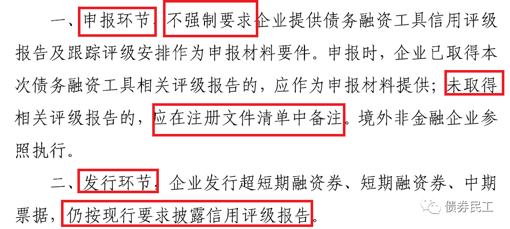 按照交易商協(xié)會之前的監(jiān)管政策,公開發(fā)行的債務(wù)融資工具(中期票據(jù)、短期融資券和超短期融資券),在注冊環(huán)節(jié)需要提交評級報告作為申報材料。此次新規(guī)出臺之后,可以將債務(wù)融資工具企業(yè)評級選擇權(quán)交予市場決定。