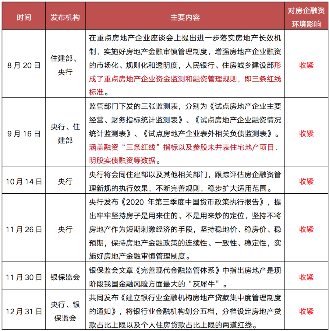 表: 2020年提出三道紅線后部分房企融資相關政策及表態
