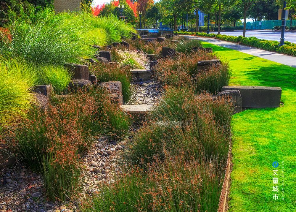 俄勒岡會議中心延伸地帶的雨園,就開創(chuàng)了海綿城市建設(shè)的先鋒,項目不僅巧妙地解決了雨水排放和過濾的問題,同時還創(chuàng)造了優(yōu)美的景觀環(huán)境空間。