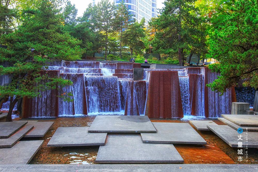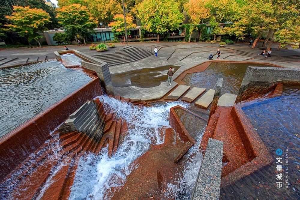 以瀑布為主題的第四站——演講堂前庭廣場是是整個系列的高潮。哈普林是從俄勒岡州瀑布山脈、哥倫布河的波尼維爾大壩中找到了設(shè)計原型。