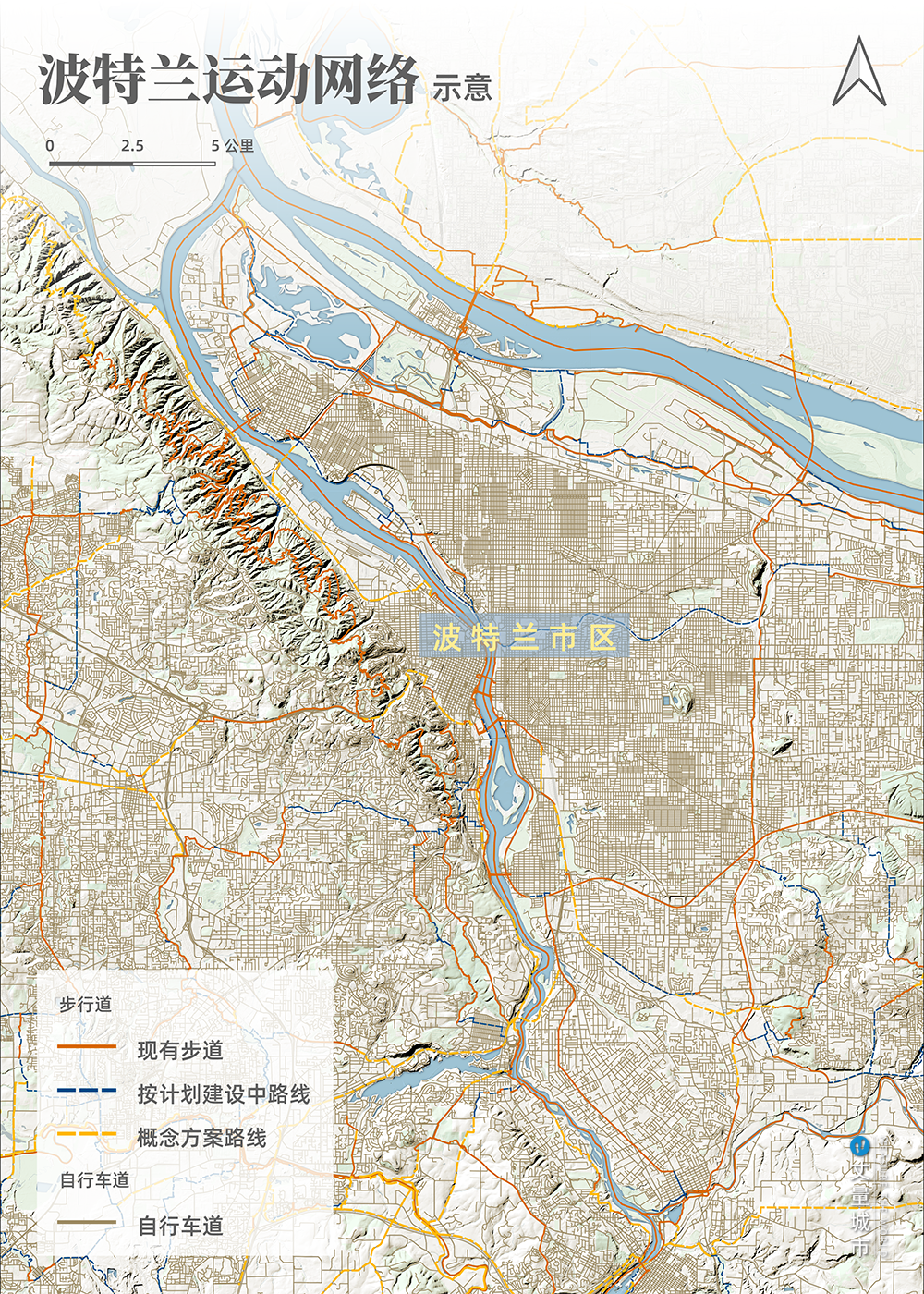 比如,在宏觀層面,雖然「城市發(fā)展邊界」限制了其向市中心以西圖拉丁山脈延伸發(fā)展,但是卻催生出了著名的波特蘭森林公園、華盛頓公園及其縱橫穿插其中的步道,不僅彰顯生態(tài)優(yōu)勢,而且為市民創(chuàng)造了豐富的休閑場所,甚至為城市旅游乃至文化品牌建設(shè)貢獻了巨大的價值。