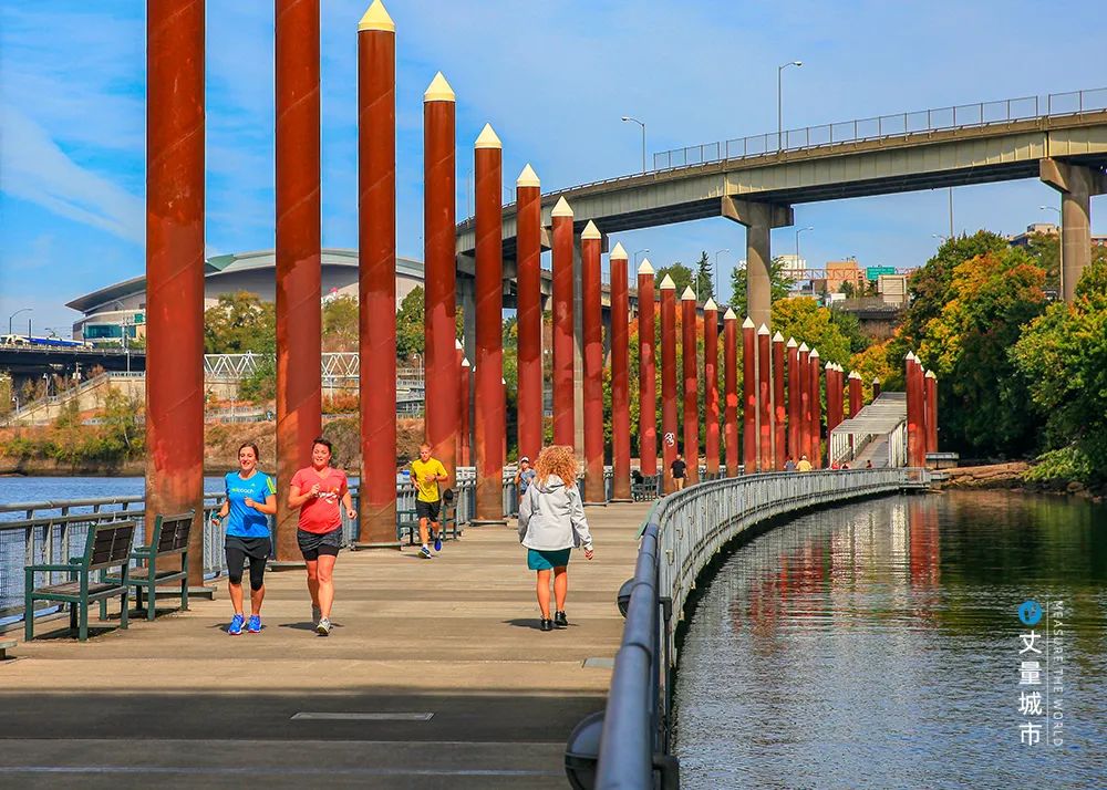 其中約有1.6公里延伸至河邊,包括位于305米水面上隨著河面的漲落而變化的人行道,與對岸的湯姆·麥考濱水公園形成良性的互動,共同成為波特蘭最為優(yōu)質(zhì)的公共空間。