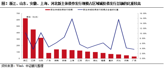 從新主體債券發行規模占區域城投債發行總額的比重來看,浙江、山東、安徽、上海、河北的新主體債券發行規模占比較高,對于區域城投債融資貢獻更大。