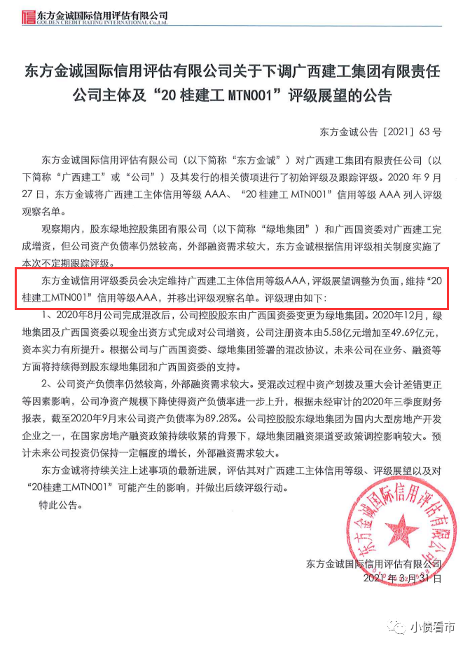 3月31日,東方金誠(chéng)公告稱(chēng),決定維持廣西建工集團(tuán)有限責(zé)任公司(以下簡(jiǎn)稱(chēng)“廣西建工”)主體和“20掛建工MTN01”信用等級(jí)AAA,評(píng)級(jí)展望調(diào)整為負(fù)面,并移出評(píng)級(jí)觀察名單。
