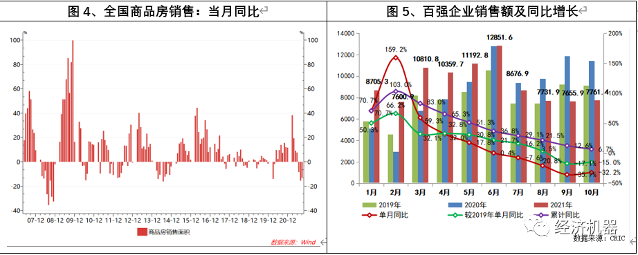 1)房地產(chǎn)銷售持續(xù)下滑。9月份全國商品房銷售面積當(dāng)月同比下跌13.2%,連續(xù)3個月同比負(fù)增長;百強(qiáng)企業(yè)銷售額10月份同比上年下降32.2%,絕對金額連續(xù)3個月環(huán)比回落。