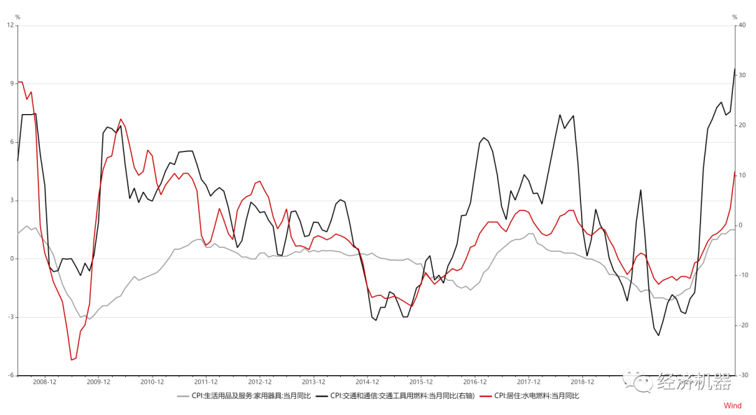 非食品通脹方面,電價在工商企業(yè)上浮比例大幅提高,尤其是對高耗能企業(yè)用電完全放開,將會推升工商業(yè)成本。用電成本在工業(yè)中處于最基礎(chǔ)的地位,類似于糧食在農(nóng)業(yè)中的作用,用電成本上升,將會加速向終端消費(fèi)傳導(dǎo)。目前水電燃料和家電類漲價跡象明顯。此外,由于國際原油價格上漲,最近交通燃料分項(xiàng)同比大幅上漲,幅度超過20%(圖17)。