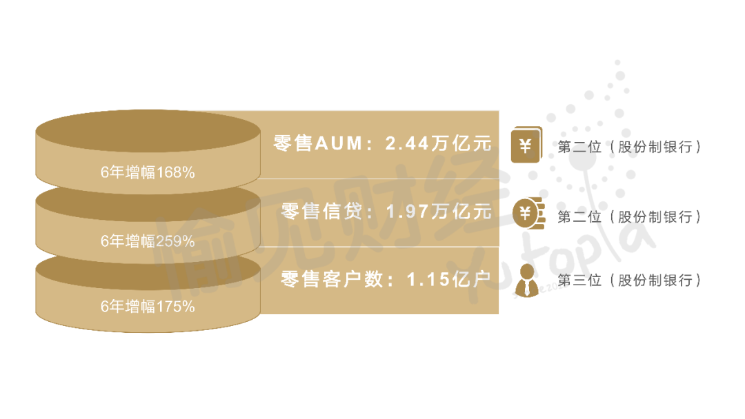 換個角度,再看發(fā)展勢能。6年前中信銀行提出零售的“四三三”戰(zhàn)略,已經帶動了零售基底完成了“助跑”階段,勢頭明顯:零售AUM,6年增幅168%,亦即年復合增速17%;零售客戶數(shù),6年增幅175%;零售信貸余額,6年增幅259%,年復合增速更是高達23%。