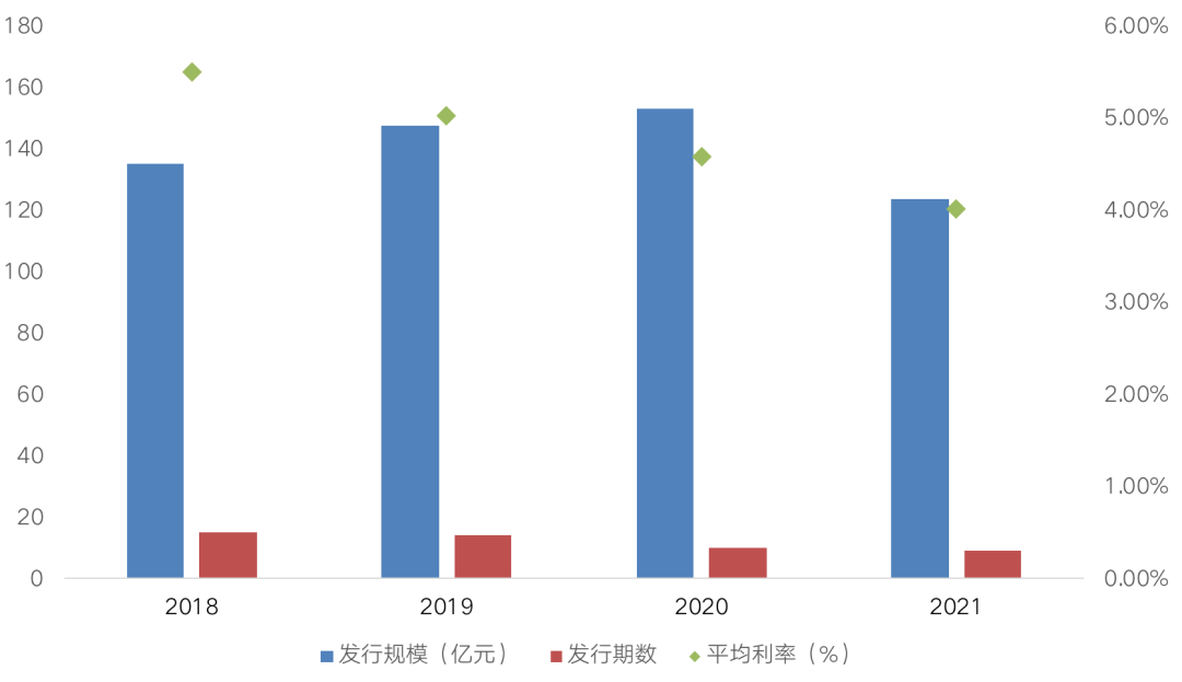 2021年政策頻繁強調加大金融支持住房租賃業務,2021年以來共發行9只、合計123.67億元,平均利率4.01%。同比利率下降12%,企業融資成本進一步降低。