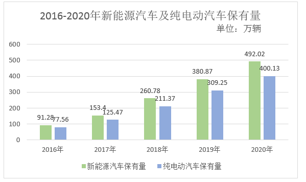 新能源汽車保有量達492萬輛。截至2020年底,全國新能源汽車保有量達492萬輛,占汽車總量的1.75%,比2019年增加111萬輛,增長29.18%。其中,純電動汽車保有量400萬輛,占新能源汽車總量的81.32%。新能源汽車增量連續三年超過100萬輛,呈持續高速增長趨勢。
