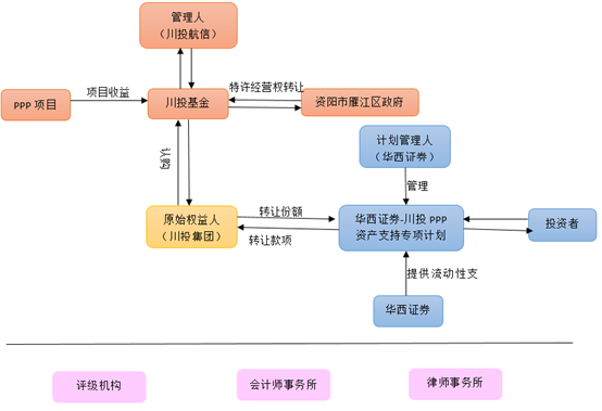 此項所涉及基礎資產為資陽市雁江區停車場PPP項目經營權,資陽市雁江區停車場PPP項目總投資3.09億元,合作期限12年,采用TOT模式運營。城東新區管委會通過簽訂PPP項目合同及其他相關法律文件將雁江區停車場PPP項目的特許經營權轉讓于私募基金(川投航信天泰2號私募投資基金),履行運營維護義務,并享受相應收益。