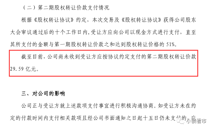 近日,中天金融(000540.SZ)公告稱,尚未按協議約定收到來自中天城投集團有限公司(以下簡稱“中天城投”)100%股權受讓方佳源創盛控股集團有限公司(以下簡稱“佳源創盛”)、上海杰忠企業管理中心(有限合伙)的第二筆股權轉讓款29.59億元,將為其提供15日寬限期。
