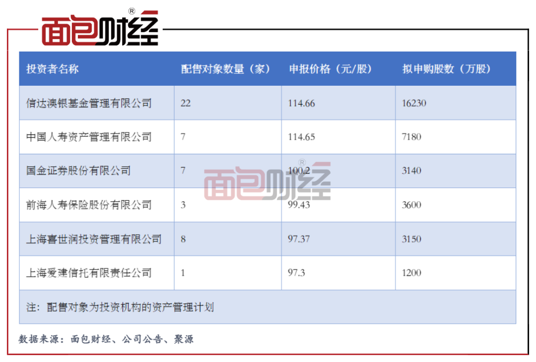 根據(jù)詢(xún)價(jià)明細(xì),將所有投資者報(bào)價(jià)和擬申購(gòu)股數(shù)加權(quán)平均得出的申報(bào)價(jià)格均值為89.23元/股,而所有投資者報(bào)價(jià)的中位值為90.79元/股。易方達(dá)和主承銷(xiāo)商中信證券分別報(bào)出的97.1元/股和94元/股明顯較高。