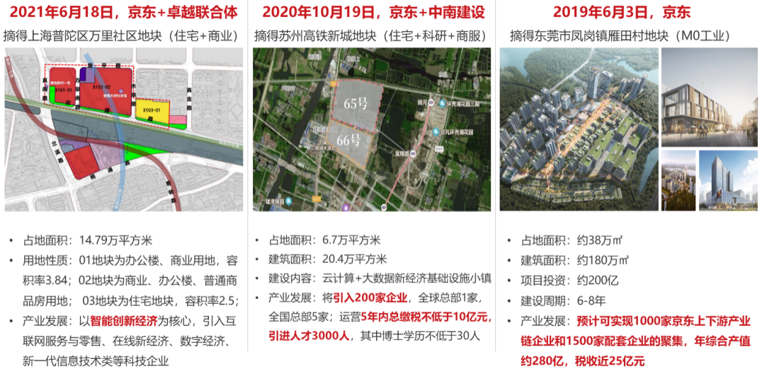 以京東為例,2020年,京東以47.3億成功摘得蘇州高鐵新城商服、科教、住宅用地,用以建設“京東智谷”項目。項目地塊面積總計17.6萬平方米,其中住宅、科研、商服用地比重約為5.6:2.9:1。2021年,京東和卓越形成的聯合體又以99.1億成功摘得了上海普陀區萬里社區用地,項目地塊面積總計14.79萬平方米,包含住宅、商業、辦公等。京東上述拿地舉動已經不是傳統的產業自用,而是將觸角延伸到了商辦,甚至住宅領域。由此可見,新玩家的目標直指開發收益?!?/p>