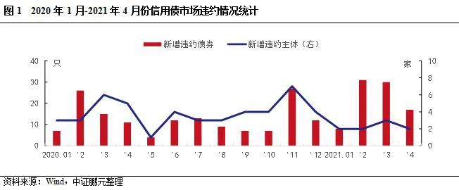 4月首次違約債券17只,涉及12家發行人。從違約類型看,首次因觸發交叉保護條款而違約的債券有5只,其他均為實質性違約。從違約事件看,除交叉違約外,12只債券均為本金利息項違約。從債券類型看,中期票據6只,公司債5只,私募債3只,短期融資券2只,定向工具1只。從企業性質看,2家新增違約主體中同濟堂為民營企業,紫光通信為中央國有企業。從上市情況看,本月新增違約主體均為非上市公司。從處置方式看,“18華聞傳媒MTN001”在2020年10月與持有人達成展期兌付協議,此外,華夏幸福、永煤控股和河南能源、鴻達興業繼續通過持有人會議與持有人達成延期兌付協議。