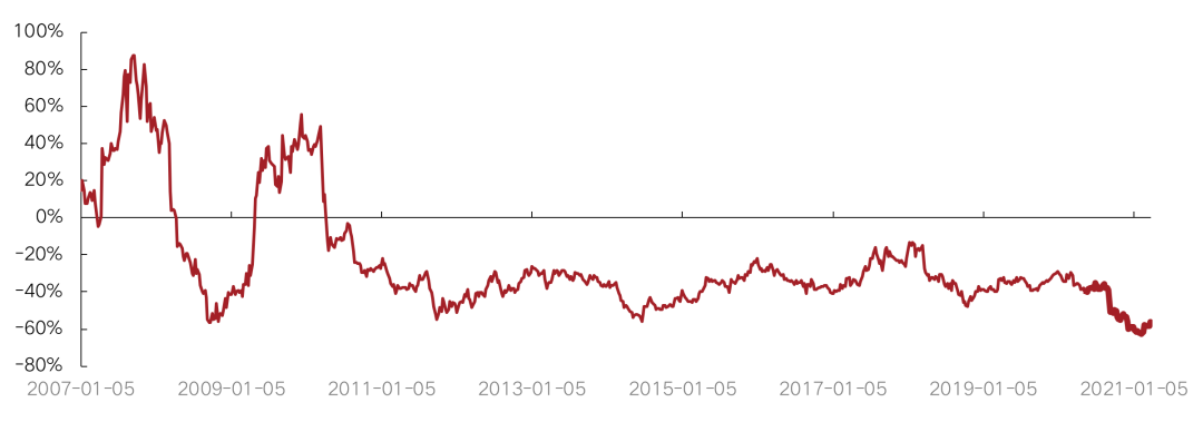 具體而言,2021年3月相對恒指成分股的PE周均值為-57.8%,高于2月相對PE周均值-61.1%,低于2020年全年相對PE周均值-41.3%。克而瑞內房股領先指數成分股整體PE周均值為7.20,高于2月周均值7.02,高于2020年全年周均值7.17。恒指成分股3月整體PE周均值為17.05,低于2月周均值18.07,高于2020年全年的周均值12.49。