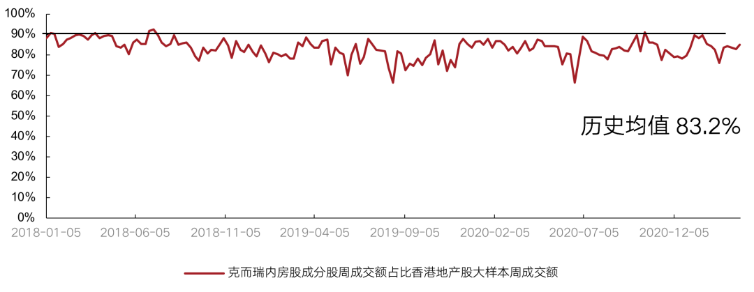 從成交額看,3月克而瑞內房股領先指數成交額占香港地產股大樣本的成交額比值總體較上月有所回升。3月該指數成交額占比周均值83.9%,高于歷史均值83.2%,高于上月周均值81.7%。