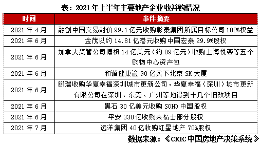 集中供地致拿地競爭加劇,收并購成為獲取優(yōu)質(zhì)土儲補(bǔ)充方式。從首輪集中供地的22城土拍情況來看,未設(shè)置土拍限價的城市如重慶平均土地溢價率達(dá)到了43%,不少設(shè)置土地價格上限的城市地塊進(jìn)入自持階段,另外如蘇州首輪集中供地前10多天的時間里,多家千億房企迅速成立數(shù)十家“馬甲”公司參與競拍。從非22城來看拿地來看,TOP50房企投資區(qū)域高度重疊,主要集中在長三角和珠三角區(qū)域,競爭亦是非常激烈。浙江、江蘇、廣東三省的非22城是TOP50房企投資三甲,三者占TOP50房企非22城投資總額的63.7%。土地市場的變化讓房企競爭加劇,除了招拍掛之外,部分資金實力充足的房企開始將收并購項目及股權(quán)作為資源補(bǔ)足的方式之一。“三道紅線”以來,融資難也是不少房企尋求股權(quán)合作的原因之一。在“三道紅線”出臺后,房企積極調(diào)整自身債務(wù)結(jié)構(gòu),對比2020年上半年和2020年全年,2020年底處于綠檔的房企明顯擴(kuò)容,占比相比年中的13%上升了22個百分點(diǎn),達(dá)到了35%。黃檔橙檔、紅檔房企占比也有所下降,由此可見,在三條紅線的壓力下多數(shù)房企都積極改善財務(wù)狀況。但在房企融資環(huán)境收緊情況下,2021年房企融資量出現(xiàn)明顯下降,上半年累計融資額同比下降27%,行業(yè)資金鏈進(jìn)一步承壓。甚至一些50強(qiáng)房企,受限于自身財務(wù)狀況,在融資難的情況下也顯示出衰落跡象,上半年投資拿地金額已經(jīng)跌出百強(qiáng)。部分房企通過賣項目或?qū)で蠊蓹?quán)合作,也是穩(wěn)定資金鏈、盤活自身現(xiàn)金流以及降負(fù)債等不得已之舉。頭部房企和大型國企、央企收并購市場較為活躍。縱觀最近兩年收并購項目可以看出,除了融創(chuàng)等頭部房企之外,華潤、金茂等也開始加入到收并購的行列,這類國企央企符合資金實力和開發(fā)能力都占優(yōu)的房企特點(diǎn),通常自身財務(wù)情況較好,他們通過收并購獲取項目儲備,輸出自身管理能力盤活資產(chǎn),是當(dāng)下實現(xiàn)差異化競爭的一條新道路。