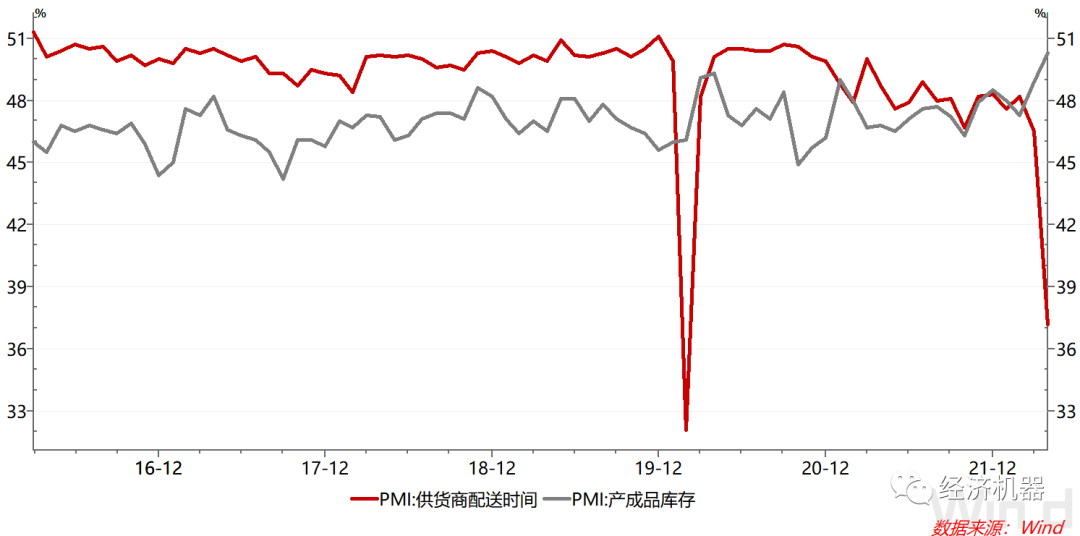 圖3、制造業(yè)PMI:供貨商配送時(shí)間和產(chǎn)成品庫(kù)存分項(xiàng)