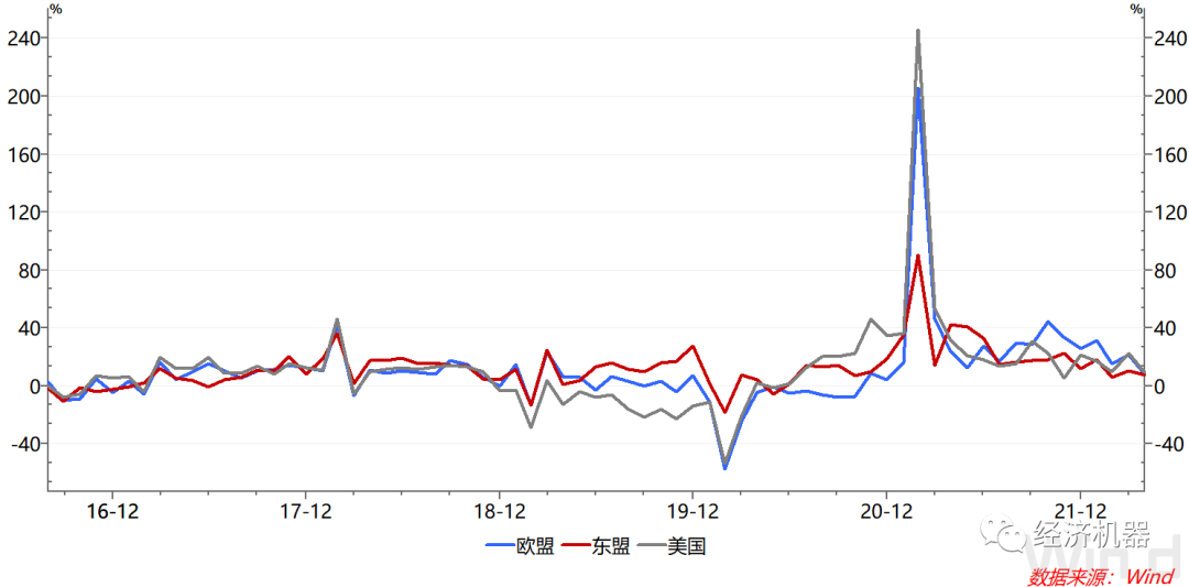 圖1、中國(guó)對(duì)美、歐、東盟出口:同比增速