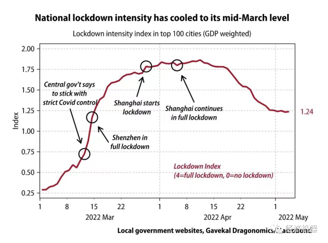 隨著各地的防疫經(jīng)驗(yàn)不斷提升,各地的封鎖程度也較上海封城后的峰值出現(xiàn)大幅放松,回落至3月中旬左右的水平(圖6)。