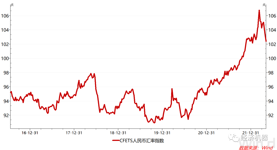 期間,人民幣匯率也表現(xiàn)的十分強(qiáng)勢(shì),2020年以來(lái)對(duì)美元持續(xù)升值。CFETS人民幣匯率指數(shù)也由2020年7月的92最高升至2022年3月的106.8,漲幅約16%。