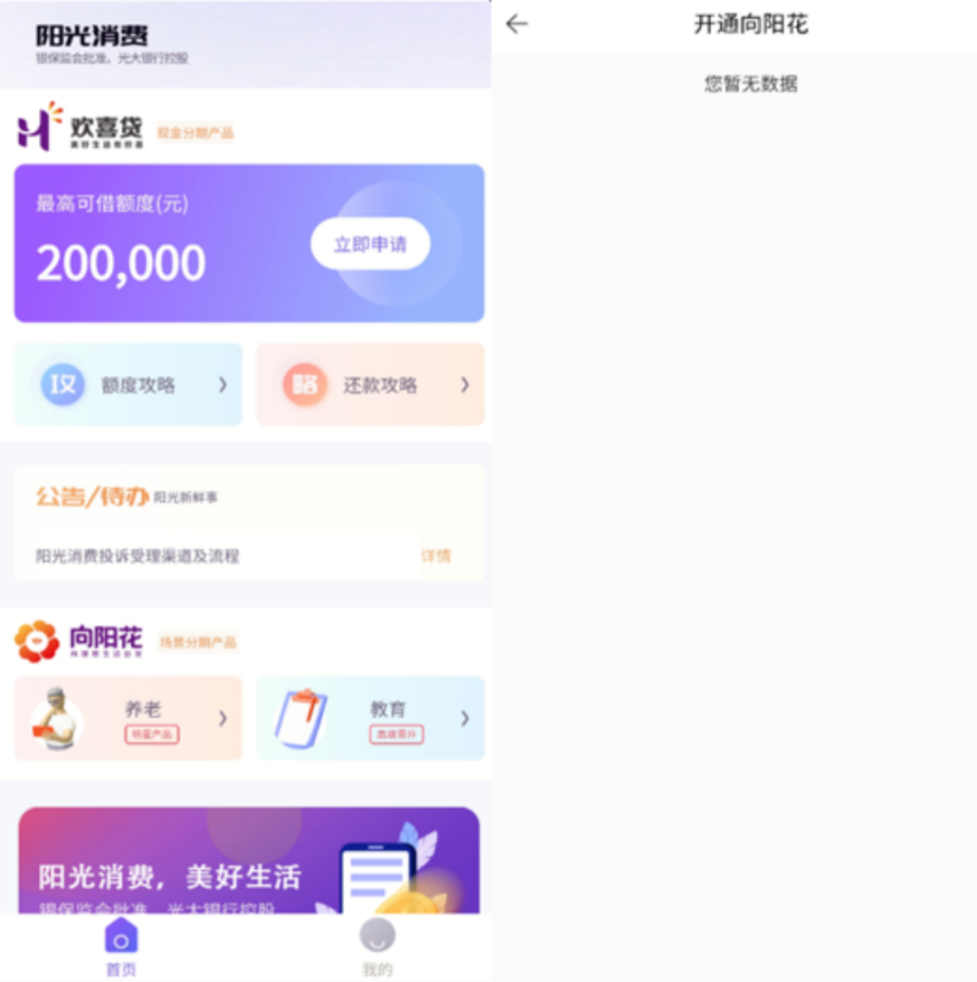 截至2021年11月,陽(yáng)光消費(fèi)金融僅有兩款產(chǎn)品:第一款是平臺(tái)開業(yè)初期便推出的現(xiàn)金分期產(chǎn)品“歡喜貸”;第二款是2021年5月推出的場(chǎng)景消費(fèi)分期產(chǎn)品“向陽(yáng)花”,該品類下還包括“養(yǎng)老(明星產(chǎn)品)”與“教育(高端晉升)”兩種產(chǎn)品。